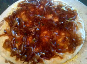Place the cooked onion on your Focaccia dough, add some thyme leaves and place in the hot oven. If you have a pizza stone, carefully slide the Focaccia onto it, making sure you have dusted it with semolina or polenta flour to prevent the focaccia from sticking. After about 15 minutes, add your taleggio.