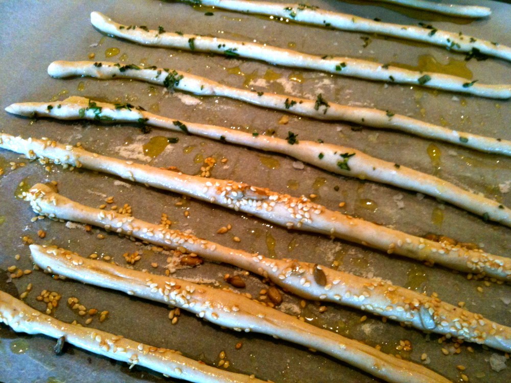 This recipie ROCKS! Mixed seeds work beautifully with it as well, as does lightly crushed rock salt. A teaspoon of brown sugar or malt in the dough gives them a slight pretzel flavour if you want a touch of Germany. Perfect for breaking pieces off and scooping dip. Just as good on their own. These sticks are a show stopper at the beginning of any dinner or lunch party.
