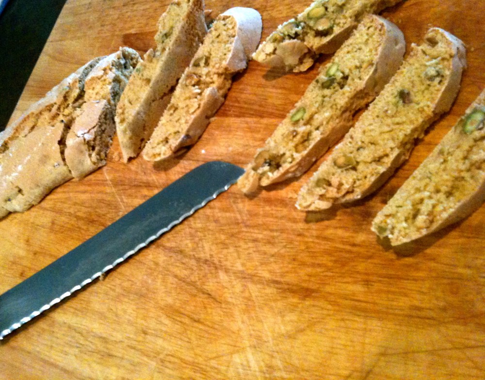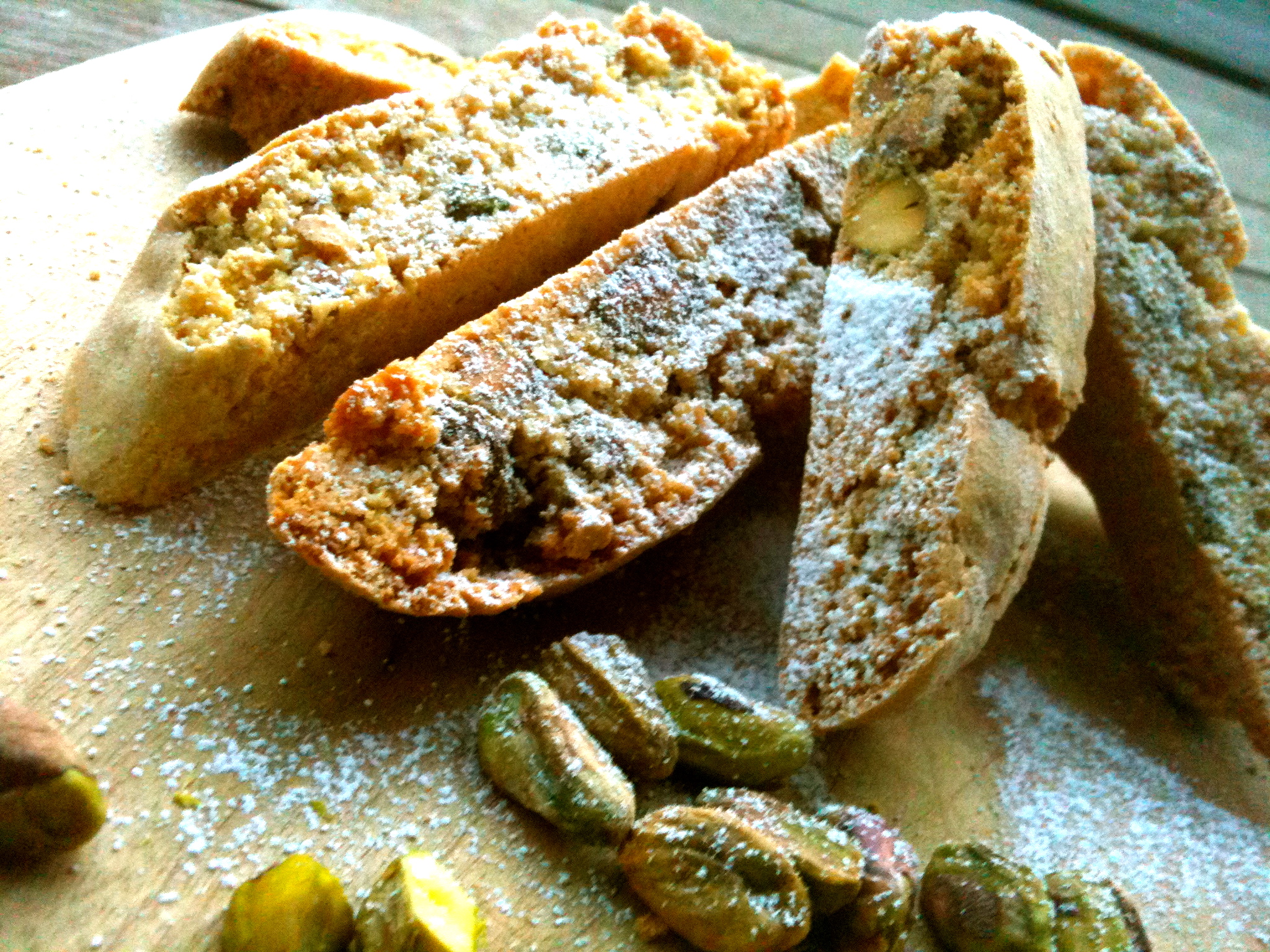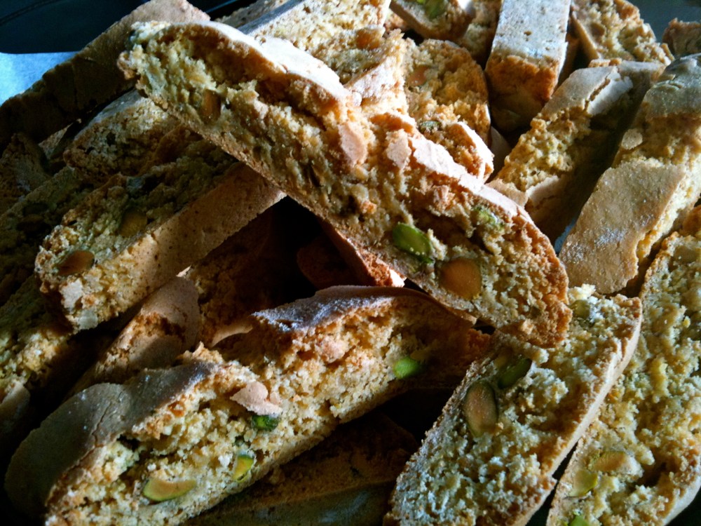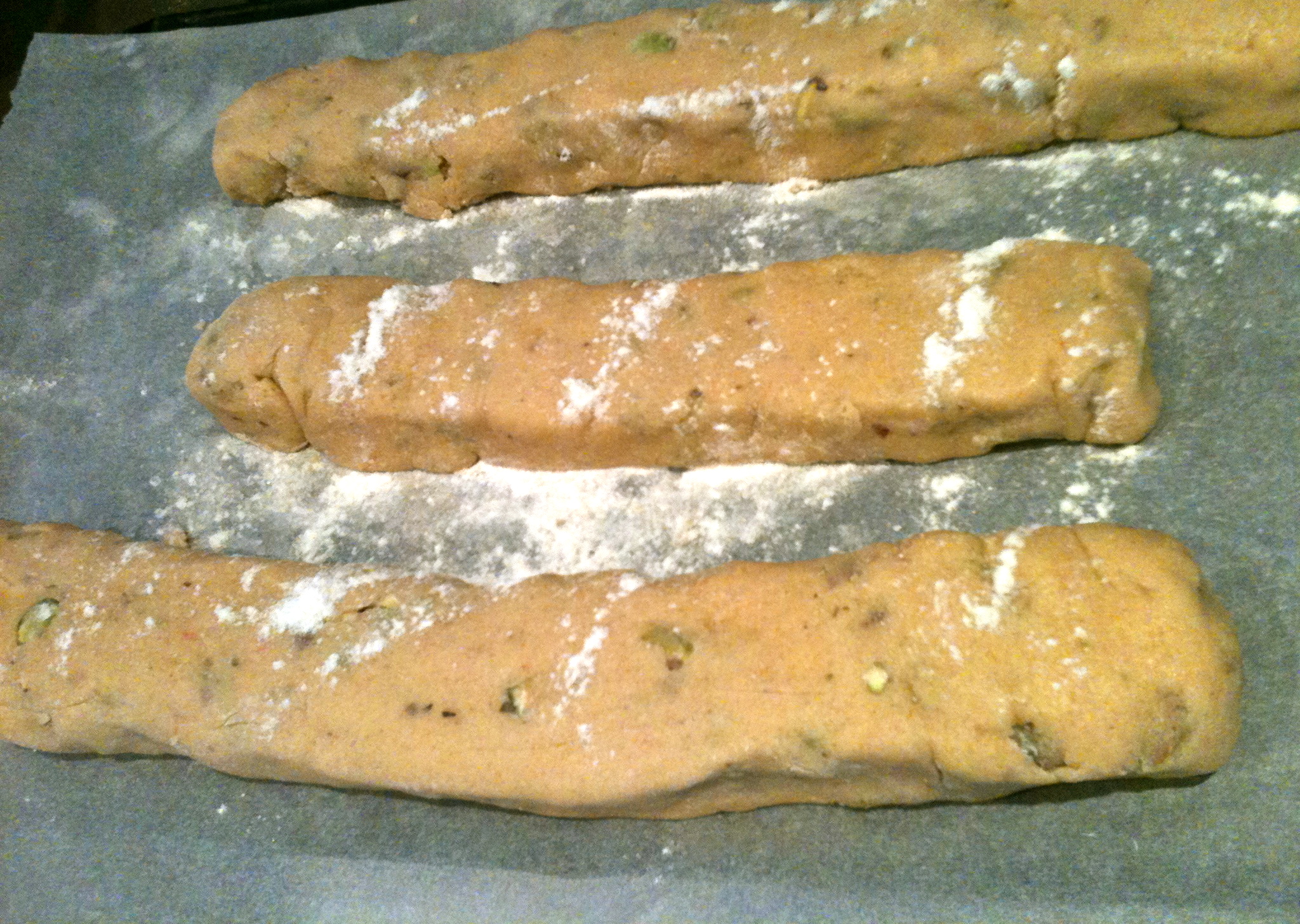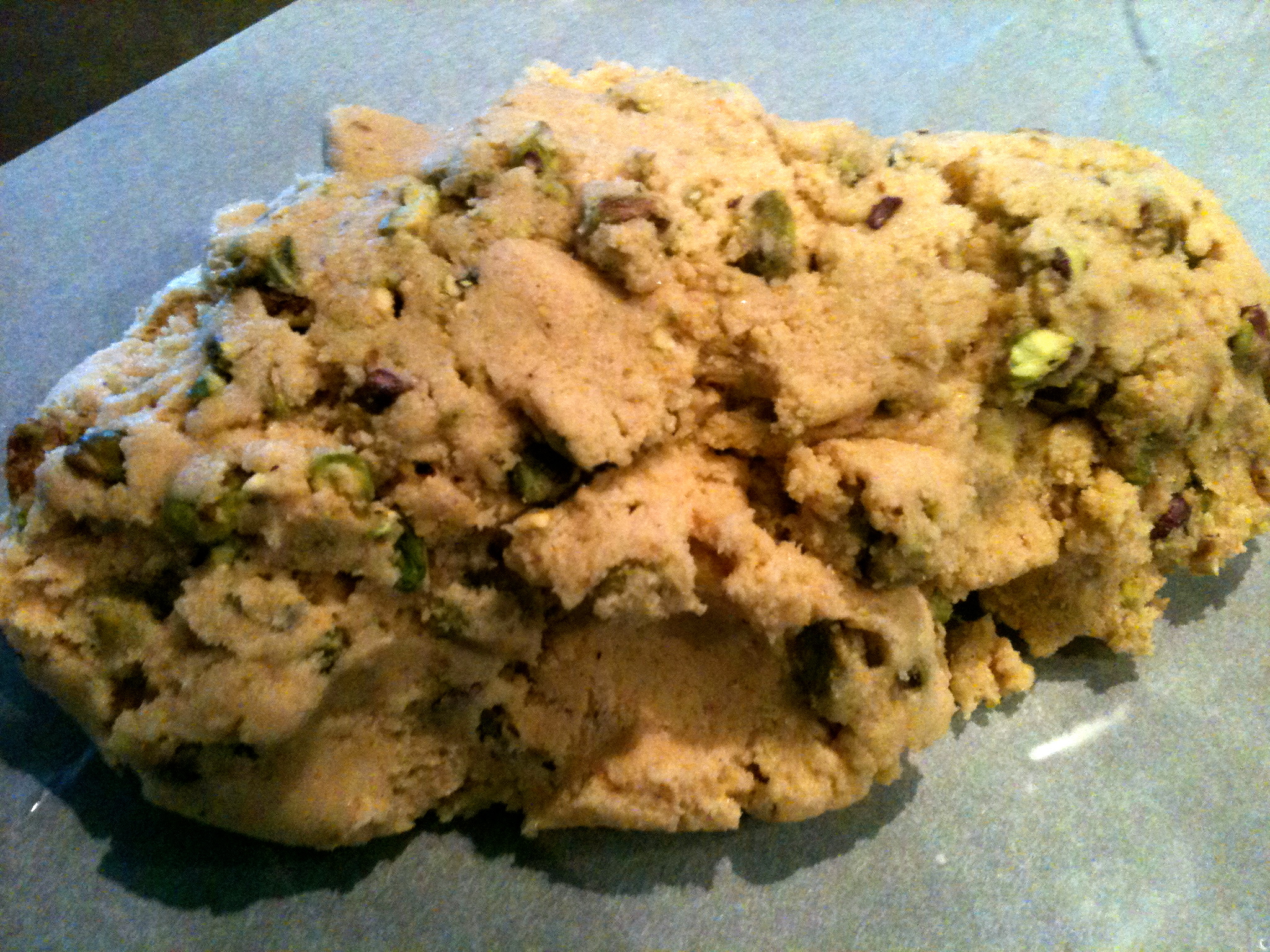 Stefano Spilli’s recipe calls for almonds, but I didn’t have any in my kitchen yesterday when I started mixing the dough and, as it often happens in Italian kitchens, I made do with what I had and replaced almonds for Pistacchios. I wasn’t disappointed.