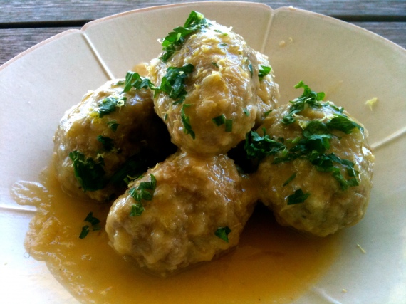 Make a soffritto with 1 chopped up onion, 1 small,diced carrot and two cloves of garlic ( simply bash them with the back of your hand and leave the skin on) and pan fry with two tablespoons of EVOO for a few minutes, until fragrant. Add the meatballs and brown them gently in the soffritto. Deglaze the pan with half a glass of dry white wine and allow for the alcohol to evaporate, then add two ladlefuls of vegetable stock and simmer, covered, for 10 minutes.