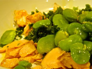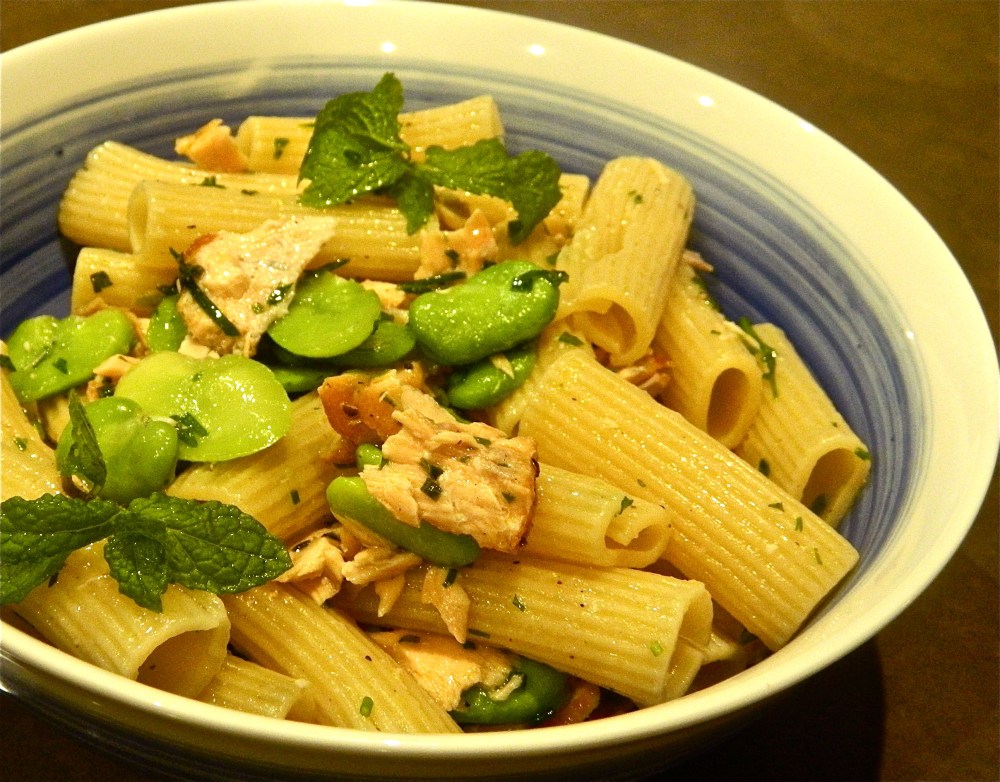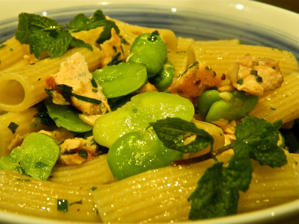 While the pasta is cooking, shell (take the skin off) your cooked broad beans, and mix them in a large bowl with the flaked up trout, the herbs, the oil and salt to taste.