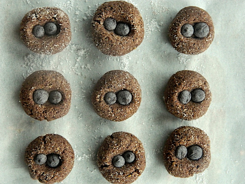 4. Gently push your index finger in the middle of each ball to create a little crate. Push two chocolate chips into each crate.