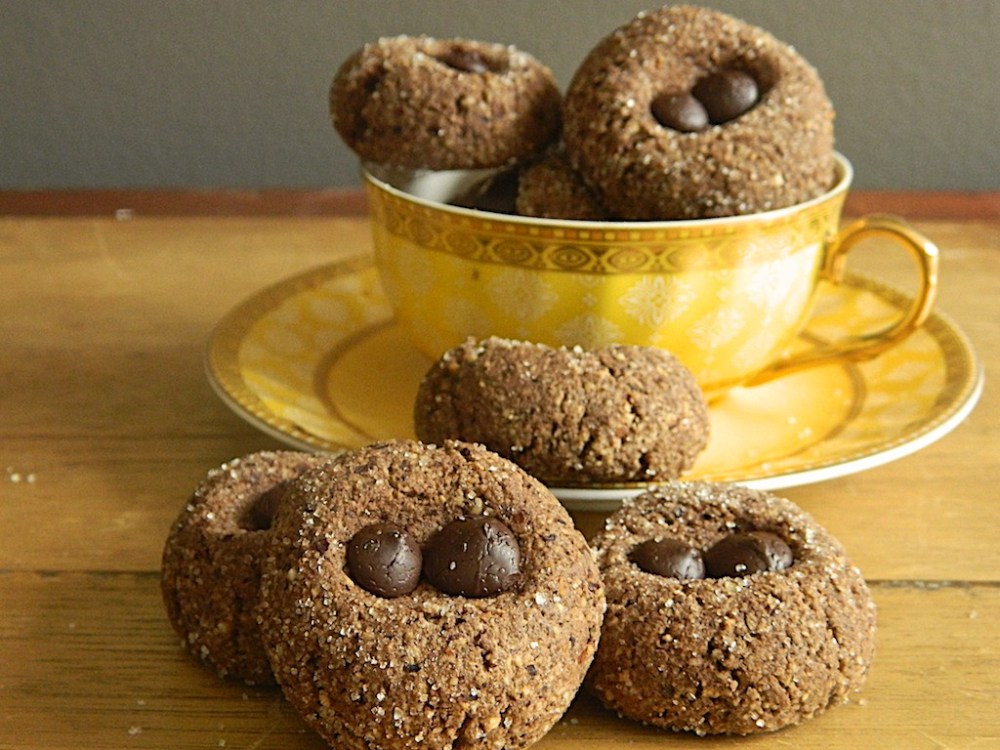 Just when I thought I couldn’t make Amaretti because I was out of almond meal (and in no way inclined to take a trip to the supermarket with child and toddler in tow) I found a half-packet of hazelnut meal hidden in the cupboard. The idea struck me immediately, but what if it wouldn’t work? Good news, it did! The savoury nuttiness of the hazelnuts , combined with the gentle sweetness of the meringue and the bitter kick of cocoa powder turns this classic Italian cookie into an irresistible grown-up affair. The addition of chocolate chips has the potential to lure children into tasting them and enjoying them with gusto.