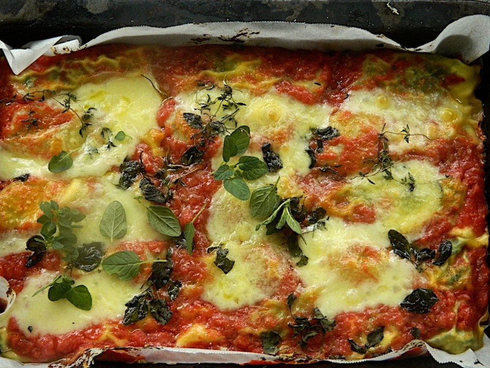 Line an oven tray with baking paper. Smear a few tablespoons of tomato sauce to create a moist bed for the cannelloni to lay on.