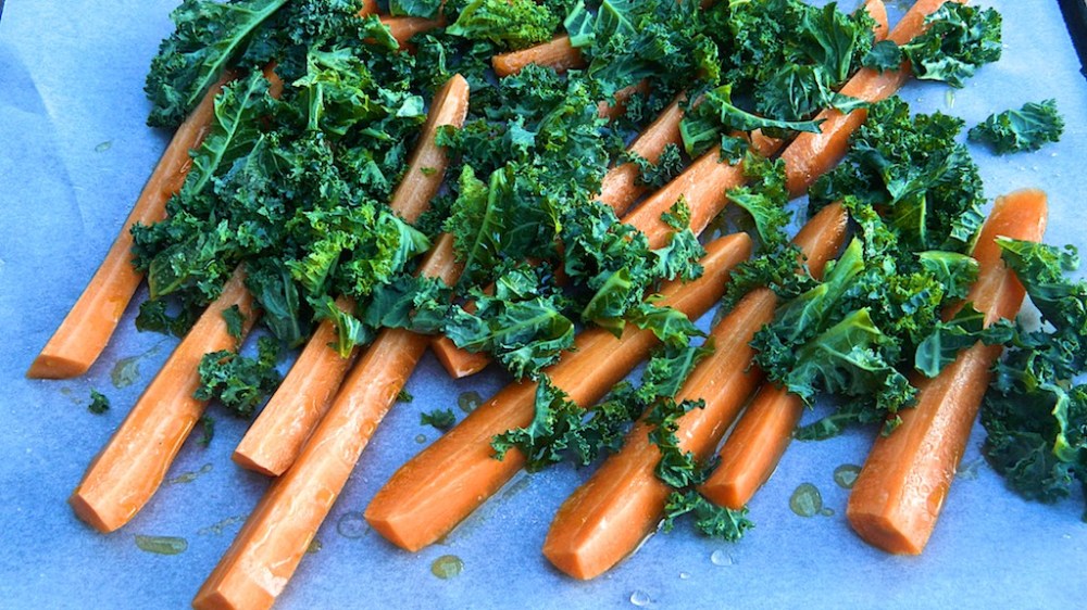 4. Put the vegetables onto an oven tray lined with baking paper and bake for 35-40 minutes or until the carrots are soft and slightly sunburnt and the kale is crispy.