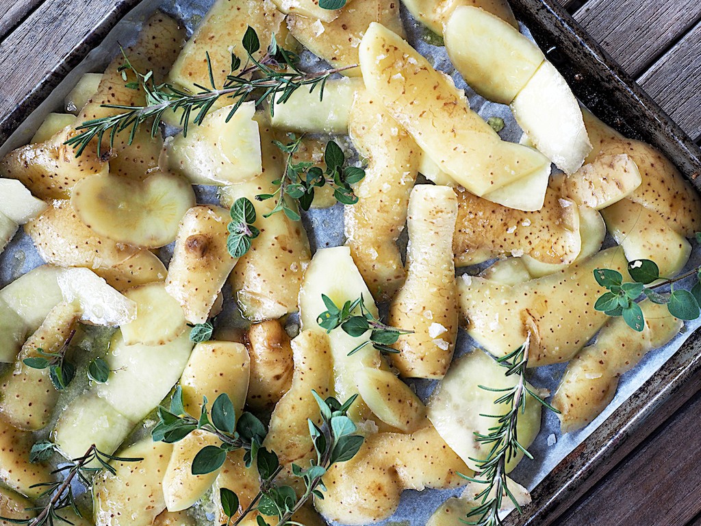 2. Drain the skins and pat dry with a tea towel. Toss them with enough oil to cover them evenly (use your hands if helpful), season with salt and herbs and arrange them onto an oven tray lined with baking paper in one layer (bake them in batches, if need be)